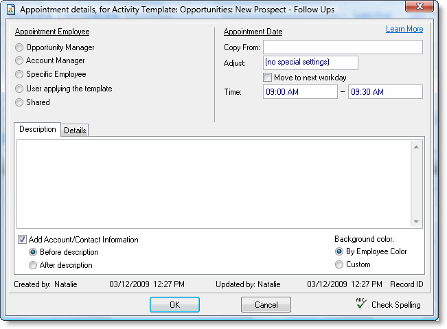 In this box you should enter a description of the appointment. When the template is applied to a specific opportunity, this field appears as the Appointment Description. If you would like the Account information to be automatically added to this field when the template is applied, you can check the Add Account/Contact info box. Including this information in this field can be helpful when exporting the task to Outlook.