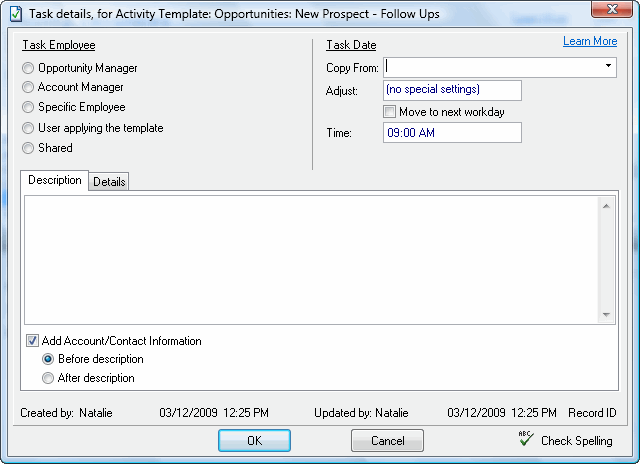 You can also specify whether the Account/Contact information should appear before or after the Task Description. To do so, check either the Before Description box or the After Description box.