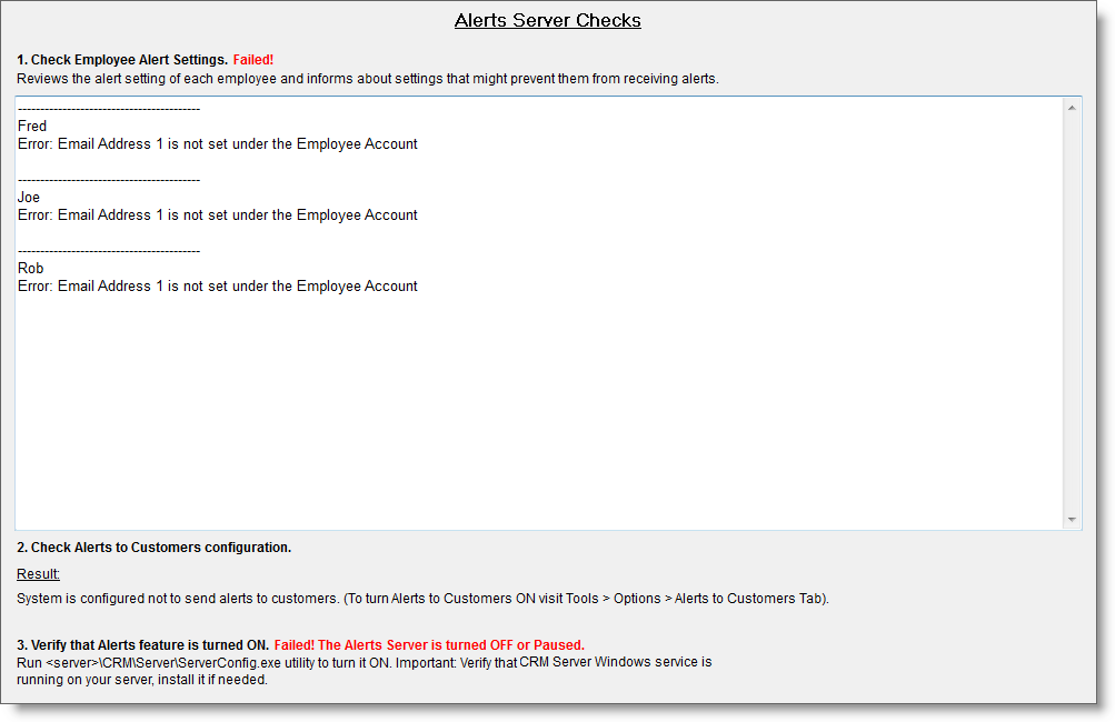 New in version 7 is a utility to check that your Alerts Server configuration and Alerts settings are defined correctly. If you've followed the instructions to setup the Alerts but still you, your employees or your customers are not getting alerts then this utility will scan for a range of problems and suggest how to resolve any that may be found.