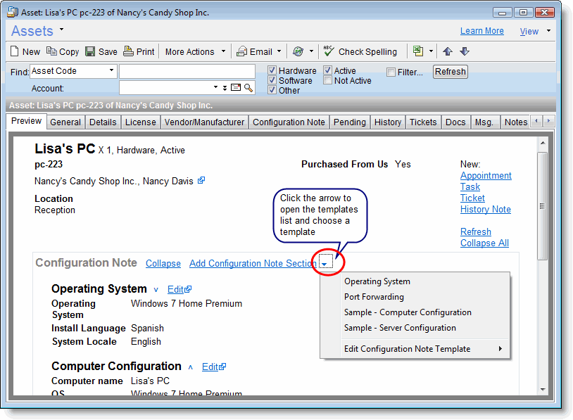 The purpose of the Configuration Note is to keep Asset configuration details, depending on the Asset type. You can define various templates which hold different data according to the Asset type, and use the templates to conveniently enter the configuration details.