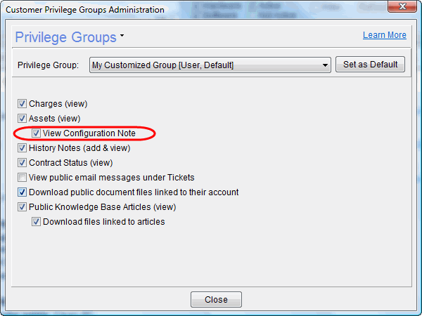 Customer Web Users Customer Web Users who are allowed to view their Asset details, can also be allowed to view the configuration note. To allow customers to see the configuration note, make sure the customer’s group privileges include the relevant privilege: