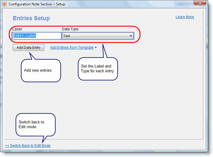 To add new entries, click Add New Data Entries, or Switch to Setup Mode.