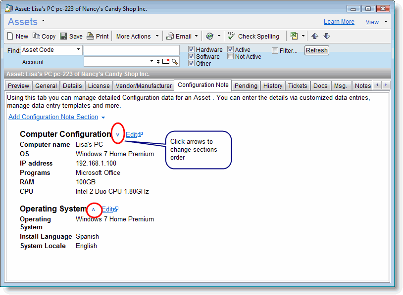 To change sections order, click the arrows at the Asset's Preview tab or Configuration Note tab.