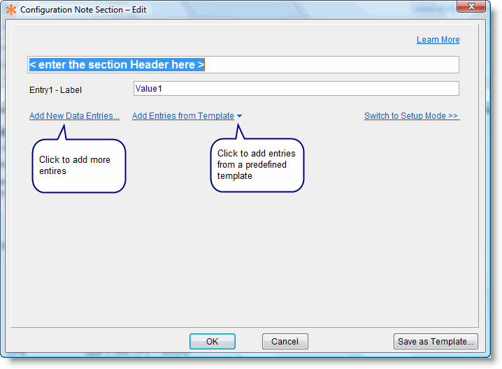 Each Configuration Note can hold several sections, and each section can contain a set of predefined entries, which can be loaded from a template. This way, you can define various note types (e.g. a different note per Asset Type), and easily enter the data via a friendly data-entry window.