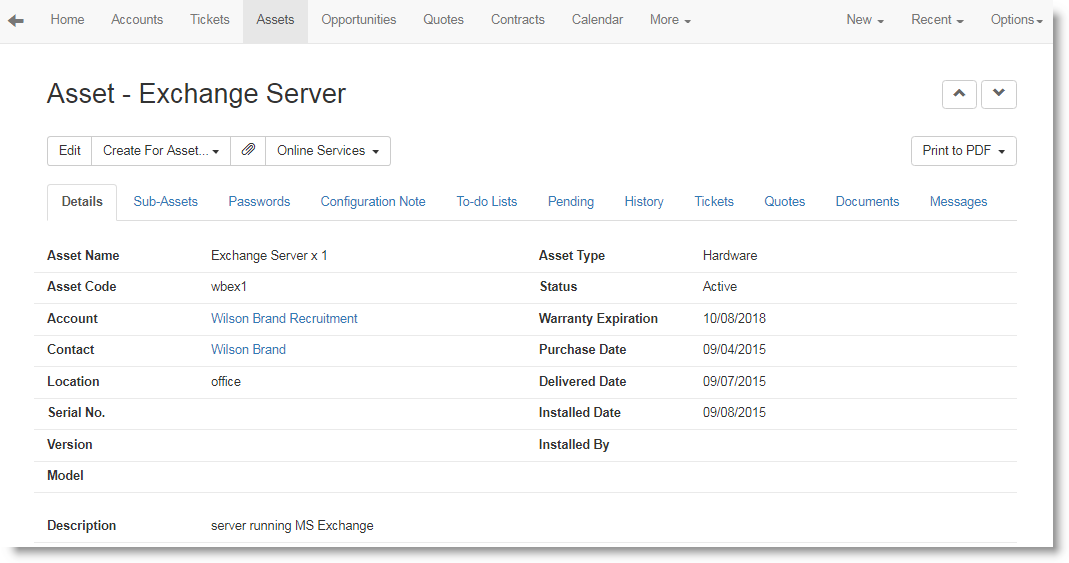 Each Asset can be linked to an Account as well as to a specific Ticket. Linking an Asset to a Ticket helps you track the Asset's service history (see Tracking an Asset's).