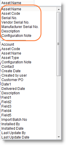 The most common searches for Assets are based on Asset Name, Asset Code, Asset Description or the Asset's Serial Numbers. To find an Asset based on information stored in one of these fields, click on the drop-down menu next to Find to select the field where the requested information is stored: