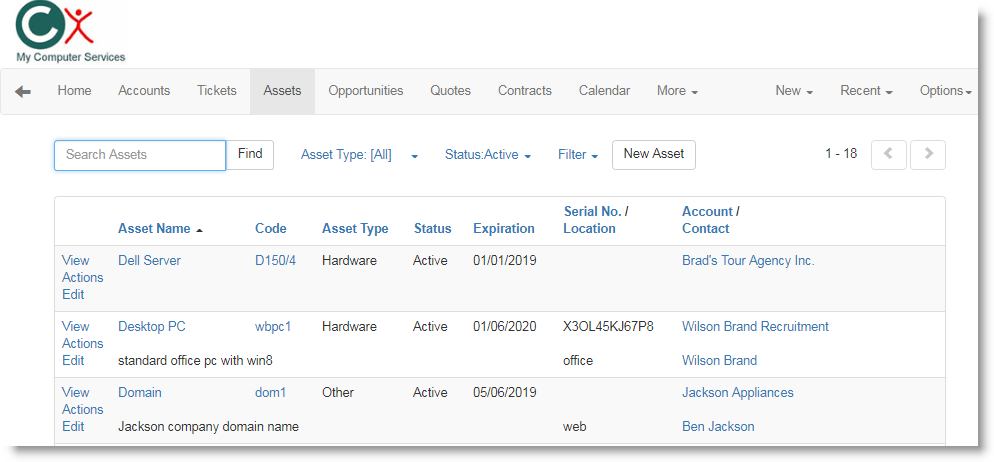 In addition, customers with web access can optionally have access to their Assets online. (Note that you can select not to show Assets to customers.)
