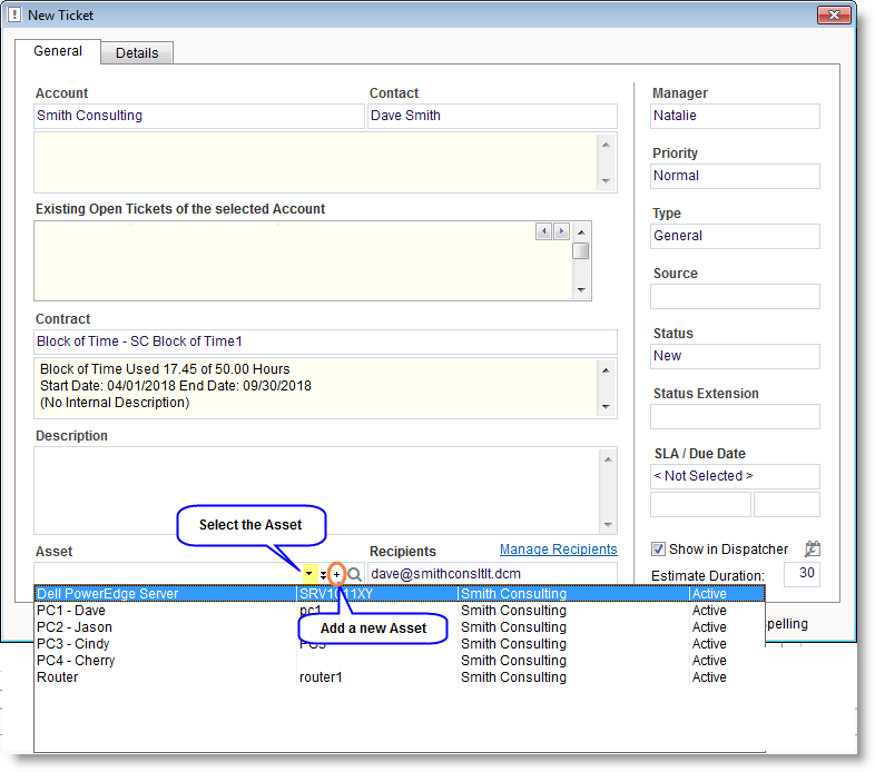 When creating a new Ticket, you can select the relevant Asset which should be linked to this Ticket by clicking the drop-down menu and selecting the relevant Asset. If you want to add a new Asset to the Ticket, you can do so from within the New Ticket window by clicking the "+" button and adding the new Asset on-the-fly. This new Asset will be automatically linked to the Ticket and to the Account.