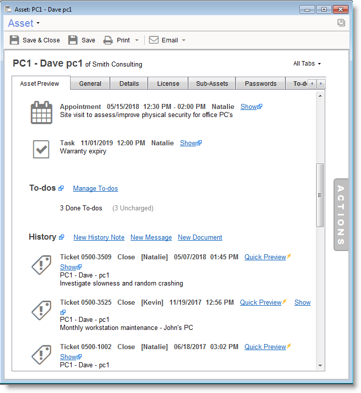 You can view an Asset's entire Service History in the Asset window under the Preview or History tab, together with any other activities performed for the Asset. Tickets can also be viewed in the dedicated Tickets tab.