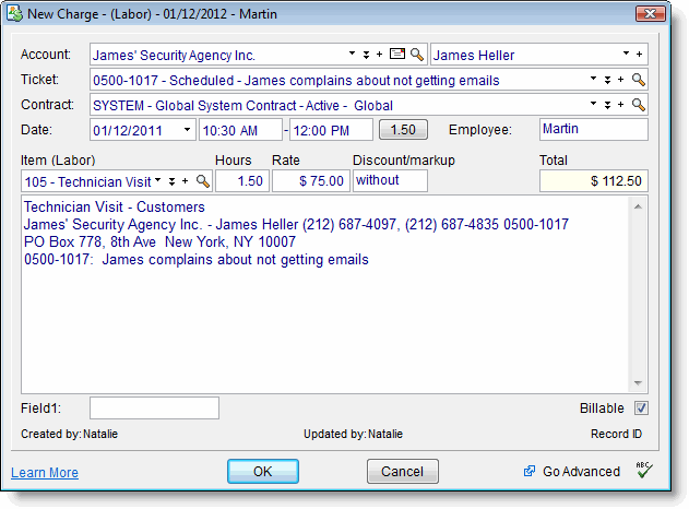 Account(mandatory) All Charges must be entered under an Account. The Account field is automatically selected when creating the new Charge from the Account/Ticket/Contract windows.