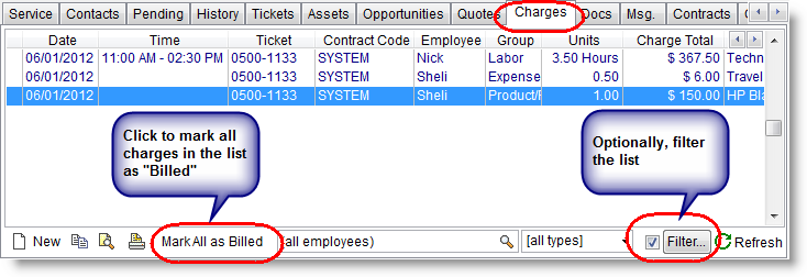 In addition to the option of changing a single Charge's status to "Billed", the application also provides a batch-update option to allow marking a group of Charges as billed at once.