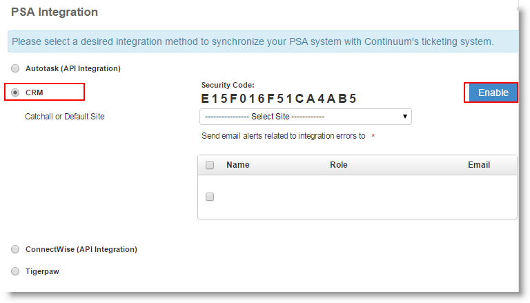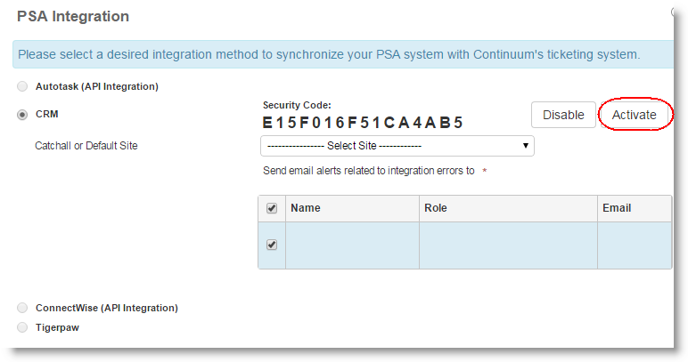 To allow CRM RMM service to connect with Continuum and sync with it, a Continuum Partner Security code (also known as PSG) is required.