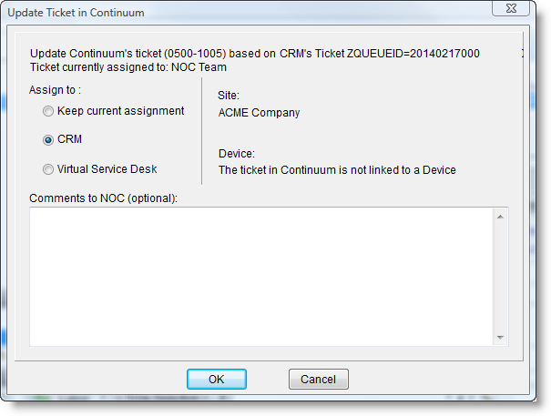 - Click OK to add notes to the Ticket in Continuum.