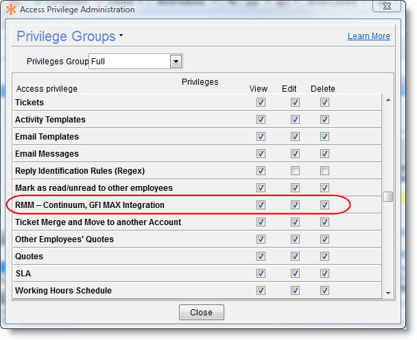 User without privilege for Continuum will not be able to link and unlink Continuum Sites, Devices and Tickets. The user will be able to view the Continuum Links Management Window in order to see the unlinked and linked Sites and Devices, however, the window will open for read-only purpose.