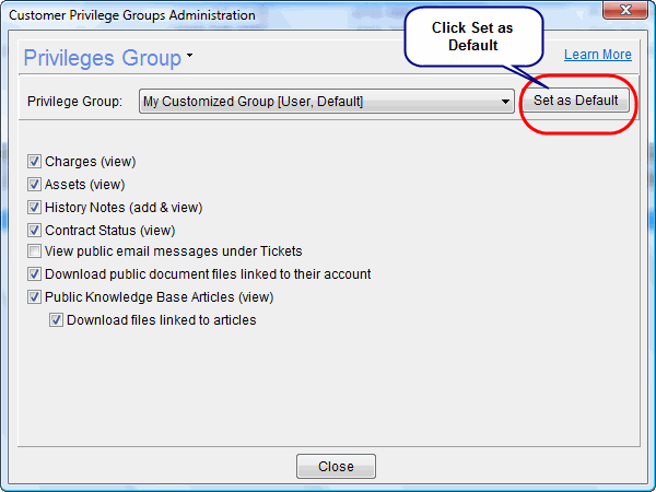 Select the privileges using the checkboxes. When done, click Close to save your changes. You can now assign the new group to Customer Web users.