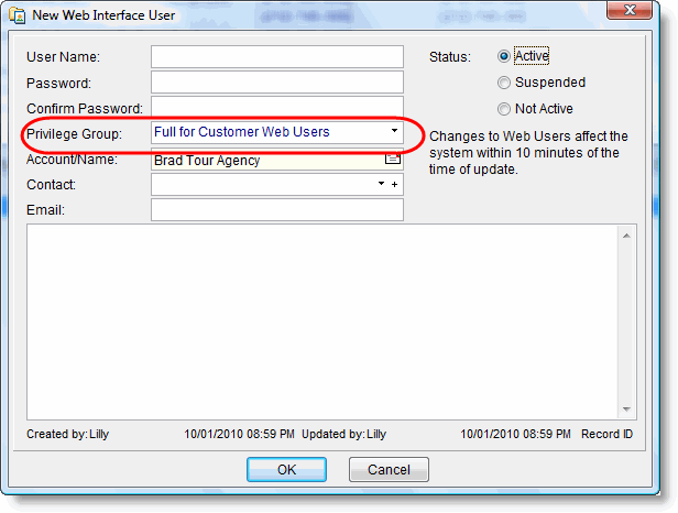 Assigning a privileges group can be done when creating a new Customer Web user, or by editing an existing user.