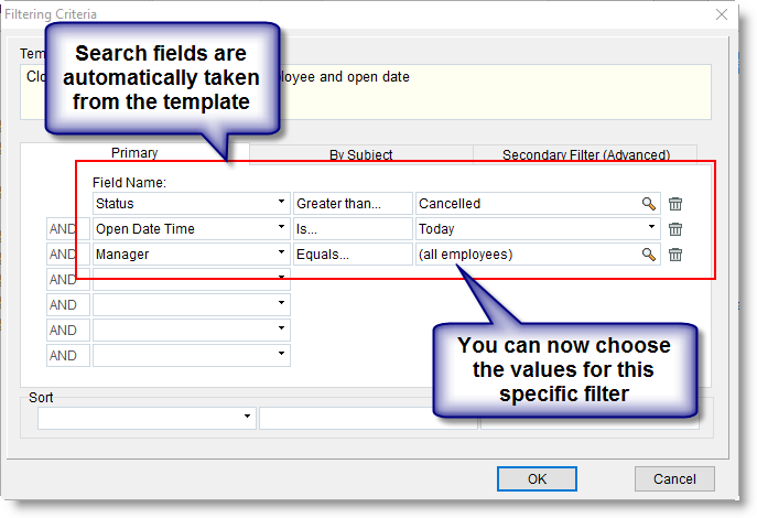3. In the next step, the New Template window opens, however, there are already predefined fields selected for this filter, as defined in the template. In this window you can modify the search criteria if needed (see New Template ).