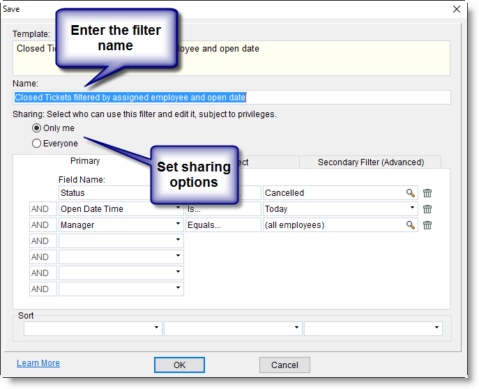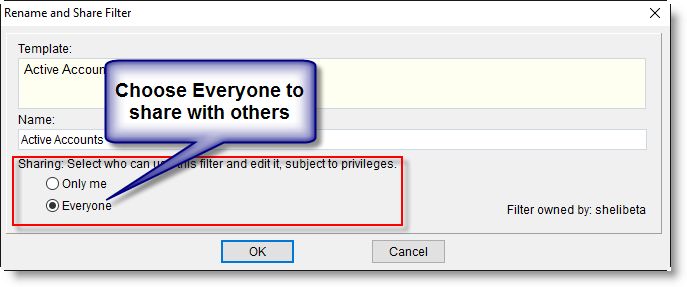 4. Choose Everyone to share your filter. Note that only users with “Save Filter” privileges can edit the filter. See more details in Employee Privileges.