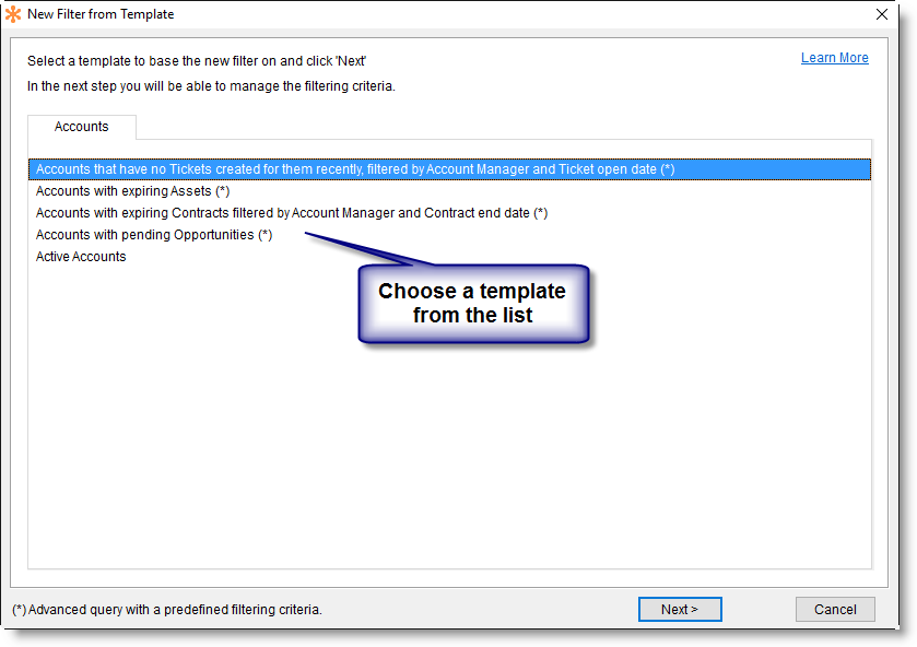 When creating a Filter from templates, some of the templates are marked with (*), marking them as “advanced”. These templates are system-defined templates and use advanced queries on data related to the entity. These queries cannot be defined manually, however, users can define the search criteria in the next window. For example: