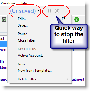 The pause and delete options provide a quick way to stop the filter from affecting the list. These options will appear when hovering over the (Unsaved) label. At this stage, you can use the filter, pause it and edit it, however, it will not be saved until you actually save it.