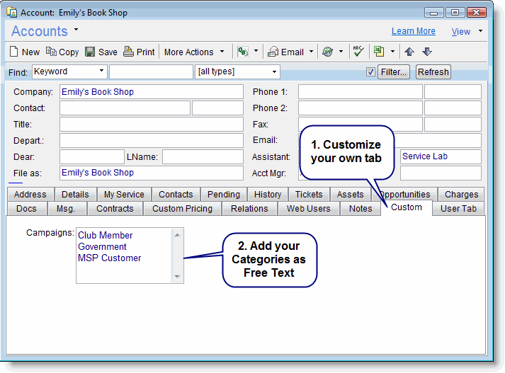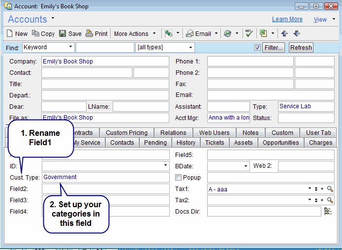 Accounts in RangerMSP can be categorized by the Account Type field. This helps you determine their main category, such as Prospect, Customer, Partner, etc.