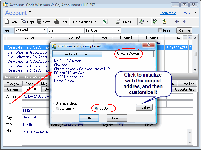 To do this, go to the account window, and click the envelope beneath the Address field in the Address tab. Here, click the Custom option, and go to the Custom tab. Click the Initialize button to copy the current address design to the custom field, and edit the design. You should save the changes and restart the RangerMSP application in order for the changes to take effect.