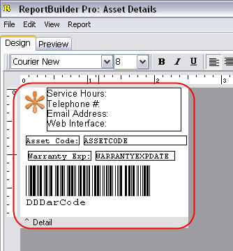 Once we have prepared an asset report layout, the next step is to populate the layout with basic Asset information needed to open a ticket. Note, you can also use barcodes in your label so that you don’t have to type each code when accessing the history for that product and you’ll be able to use a barcode reader instead.