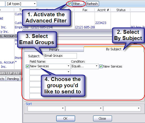 Before you can send out the group emails, you need to filter the accounts list according to the group you want to email to, so that the system knows which accounts you want to send the group email message to. Filtering the list is a rather simple task to perform since we’ve added all the fields to the same Field Subject Category (i.e. ‘Email Groups’). Once you’ve filtered your account list to only include the accounts in a specific email group, you can go on to sending the email message.