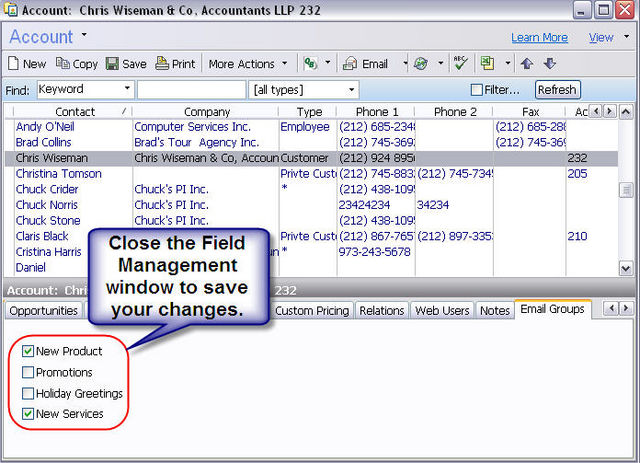 At this point, you’ve already created an Email Groups tab with checkboxes representing each email group you’re managing. The next step is to subscribe your accounts to relevant by marking fields that they want to be subscribed to. This needs to be done separately for each account; however, you can have this field updated while importing new accounts from external files.