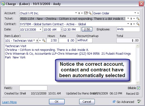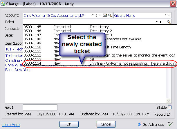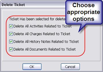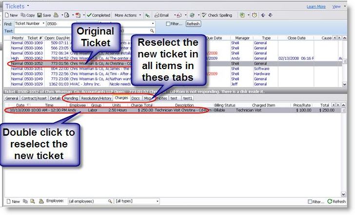 Once you have created the new ticket, all the appointments, tasks, charges, and history notes are ready to be moved to the new ticket. The easiest way to do this is to select every item in the pending/charges/history/docs/msgs tabs of the original ticket, and reselect the newly created ticket. This will effectively move the subsequent entries to the new ticket, also adjusting the account and contact you’ve selected while creating the new ticket in the previous section.