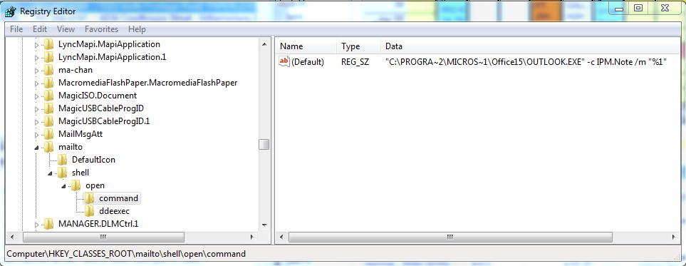 Even though all the mailto links may be setup correctly in the Windows “Default Programs” control panel this mailto registry entry may be pointing to Chrome.exe, possibly due to some Chrome add-in trying to handle mailto links.