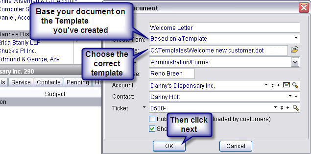 Many businesses use Templates in order to create documents that include customer data. Using RangerMSP, you can create document templates that also include information regarding your accounts, and have it filed in your RangerMSP documents tab for the customer you're creating the document for. This method allows you to take information from the accounts data source, add them to your template, and save the template to be applied to as many accounts as you like, each at a time.