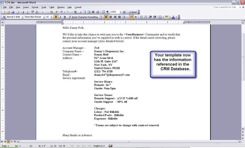 When creating your RangerMSP Document Template, MS Word will be opened and you’ll be allowed to add in your static text. Once the static text is placed in your template, all that’s left is to add your RangerMSP data to the correct spots in your text save and close your document. The template will be stored on your server, and keep a reference to it within RangerMSP, for easy application of the template.