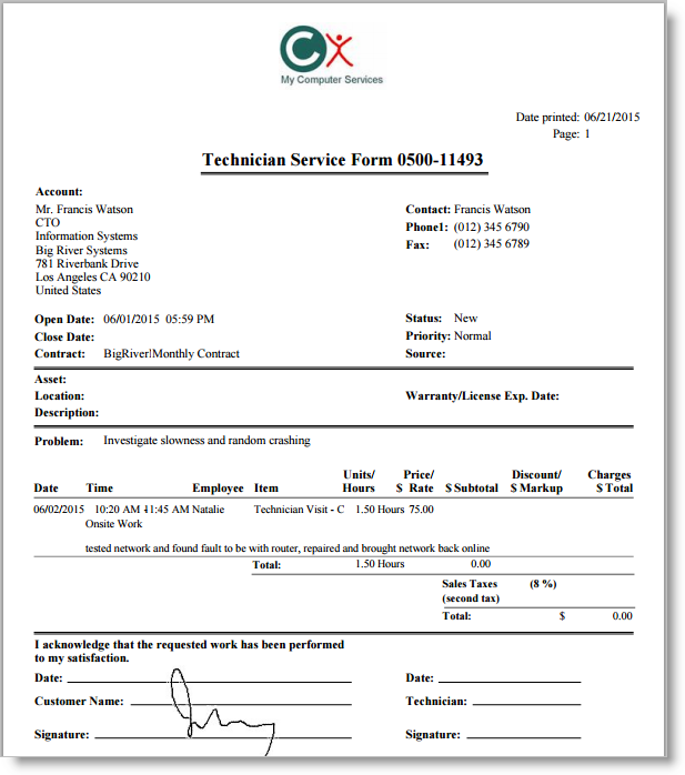 System Technician Service forms already have the signature field included, however it should be added manually to the custom service forms.