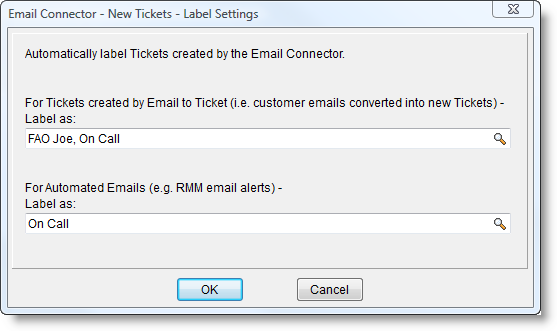 You can automatically label Tickets created via the Email Connector - for Email to Tickets and for Automated Emails. To do so just go to Settings > RangerMSP Email Connector > New Tickets - Label Settings and then you can click the magnifying glass on either or both of the boxes to select Labels and select one or more Labels to use for generated Tickets.