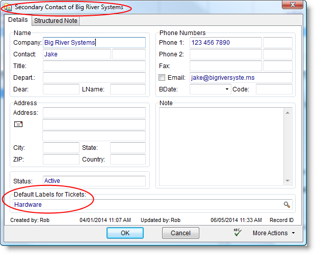 You can automatically label Tickets created by a specific Contact. To do so just select the Contact in the Accounts list and double-click to open the Secondary Contact popup, click the magnifying glass in the Default Labels for Tickets box and select one or more Labels to use for all Tickets created by this Contact.