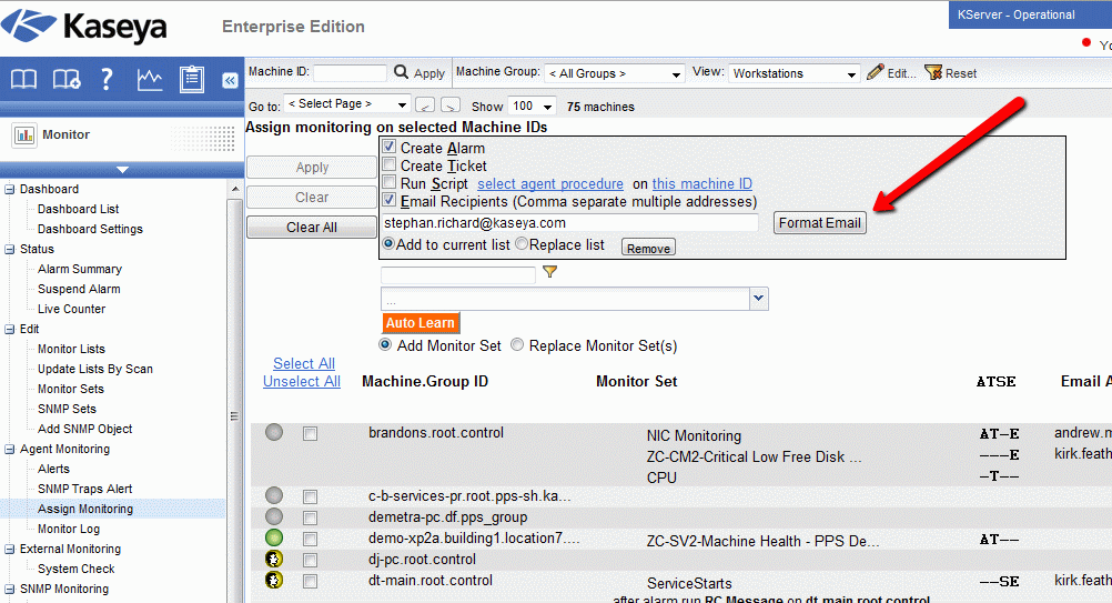 2. In Kaseya go to each of the areas listed below, select Email Format, and add the following to the subject of each email template: