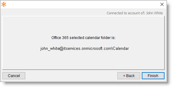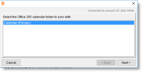 4. Click ‘Select’ button to connect to Office 365 and select the calendar folder to sync with. The following window opens.