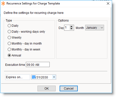 Recurring charge templates can be managed using the main Charges window. You can also review customer specific templates under the customer Account Charges tab.