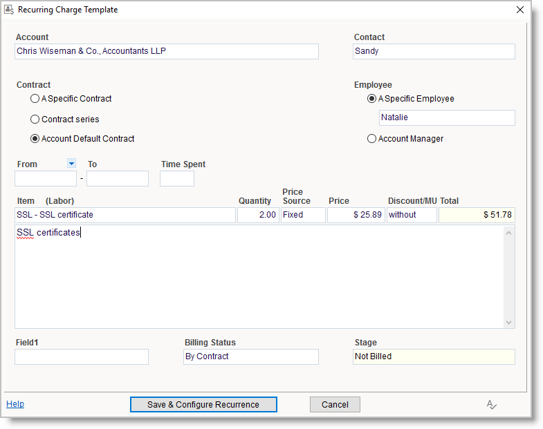 From - To Time /Time Spent Enter the From/To time or only the Time Spent for the Recurring Charge.