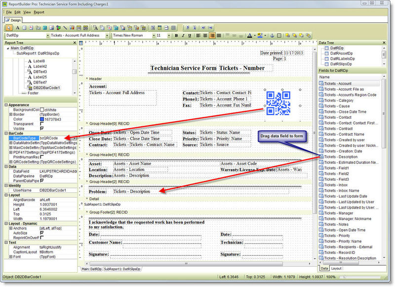DBMemo This tool allows you to insert larger text memos from the database in the same manner as the previous tool. It is resizable in the report generator, and is ideal for Ticket Description, Account Notes, Charge Description, etc.