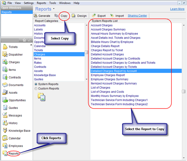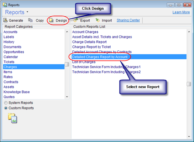 2. Design reports data and layout – You can customize the layout and data of any report to fit your needs using the Report Designer. You should first copy the report to you Custom reports, and then Click Design to open the Report Designer.