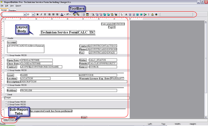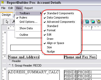 In this view, you are free to manipulate the position or size of any of the text labels or the data components. In the Default view shipped with the designer, you’ll notice there is a single tab (multiple tabs in some reports), the lower part of the screenshot above, your layout in the middle. Also, you’ll see 5 visible toolbars in a grouped configuration, there are also 5 hidden toolbars. These toolbars are as follows.