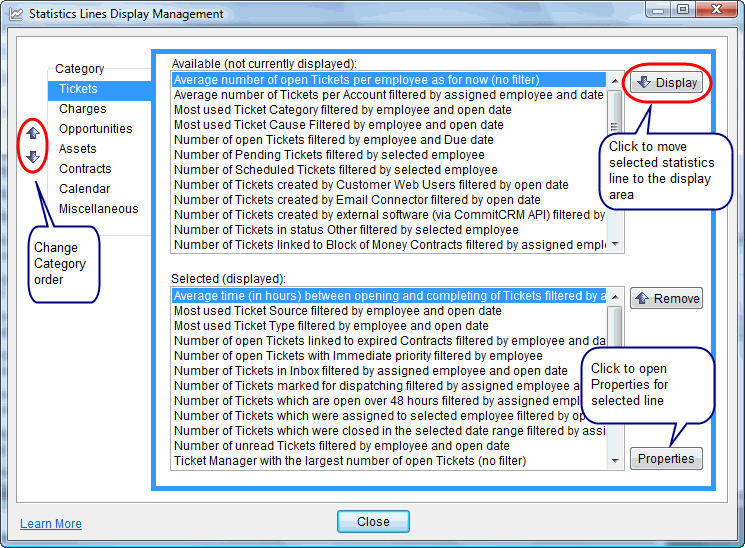 • Set Which Statistics are Displayed - for each category the relevant predefined statistics queries are displayed on the right pane, and you can choose which are displayed by moving them to the bottom tab (click the Display button after selecting a query you want to add to the display).