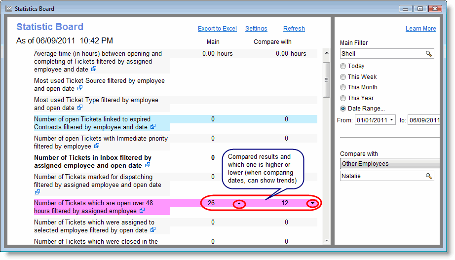 For example, you can compare all Ticket statistics of a specific employee with another employee and check performance for a given date range. Or, see Ticket volume this month and compare it to the same month's results in the last year.