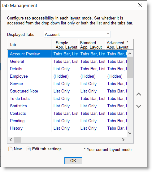 4. In the Tab Management popup you can now define the name of the tab and you can specify whether to show or hide the tab in either Simple or Advanced layout modes and if shown then whether it should be in the tabs bar and list or just the tabs list or even hidden from both.