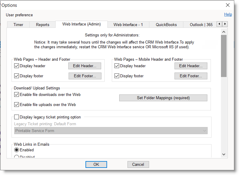 To display headers and footers, login to RangerMSP, open the Options window, go to the Web Interface page and check the Header/Footer checkboxes (these are checked by default). Click Edit Header and Edit Footer to design these parts using HTML.