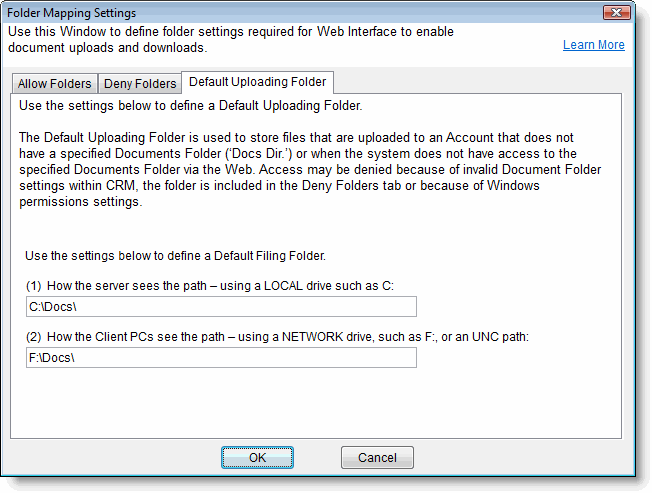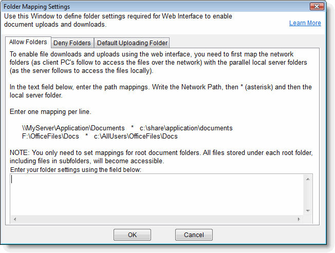 Document Folders Mapping In order to allow file downloads and uploads, you should first map the folder locations for the documents, so that the Web Interface Service will be able to access them for download and uploads. You can also define folders which will deny access, in case you need to protect sensitive information from being accessed via the web interface.