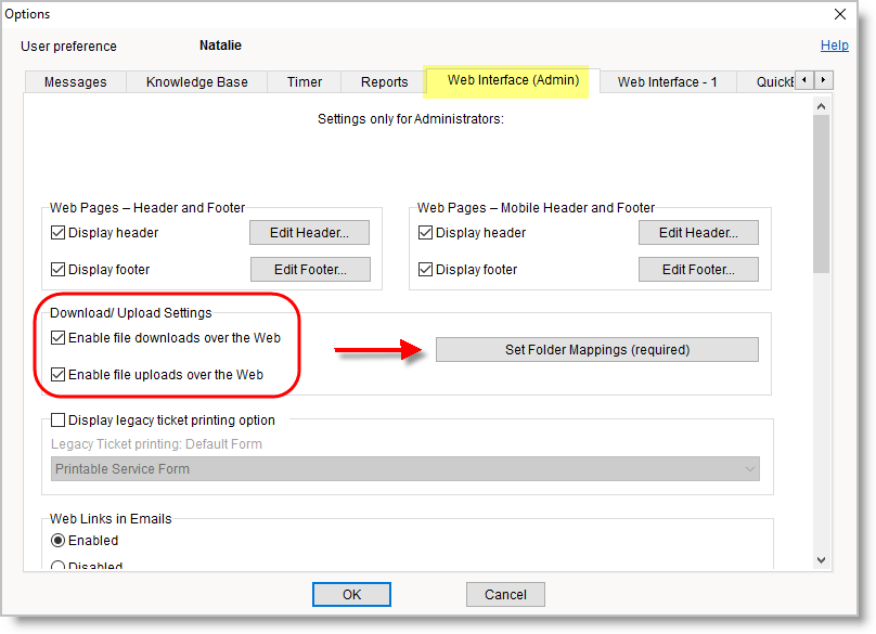 To enable uploads and downloads, go to Tools > Options > Web Interface (Admin):